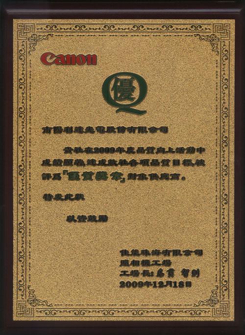 ??????? 12月18日,公司在佳能的供應商“優(yōu)質(zhì)獎?wù)隆北碚脙x式上受到表彰,并由佳能島貫工廠(chǎng)長(cháng)頒發(fā)了優(yōu)質(zhì)獎?wù)伦C書(shū)。