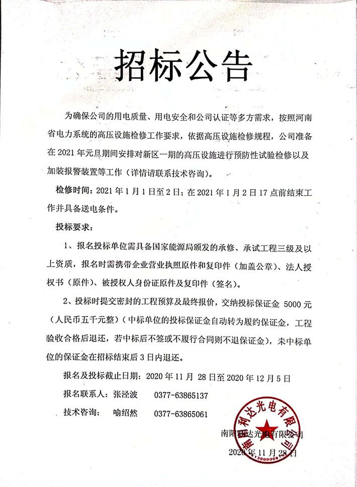 新廠(chǎng)區高壓配電設備預防性試驗招標公告