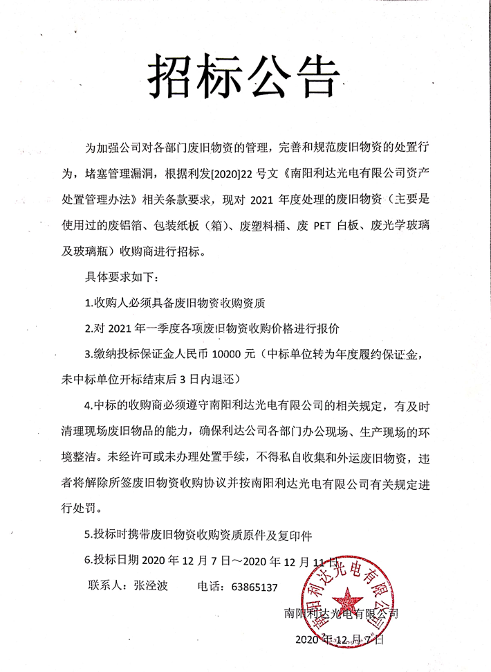 2021年度廢舊物資收購資質(zhì)招標