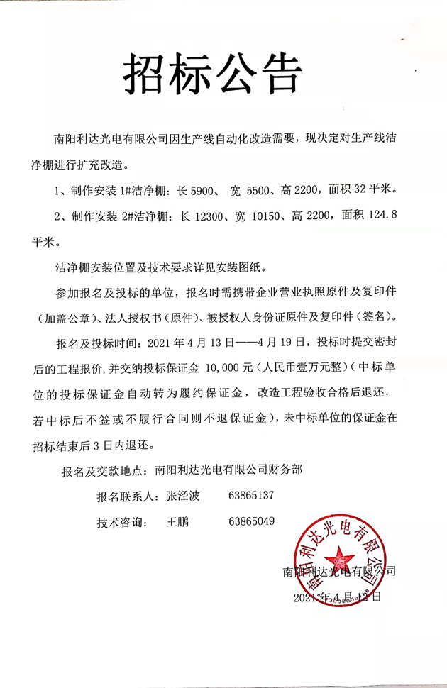 生產(chǎn)線(xiàn)潔凈棚擴充改造招標公告